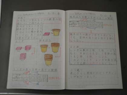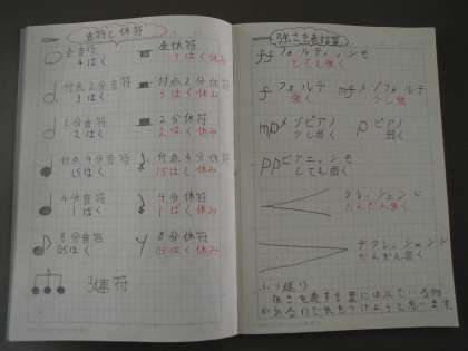音楽の様々な記号の意味を調べてまとめたノート。比例の学習を復習し,自分でまとめたノート。よく頑張っていますね。