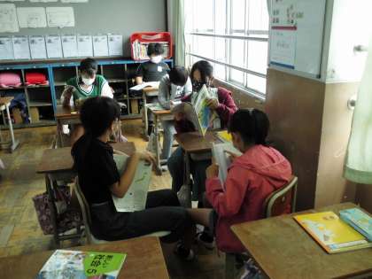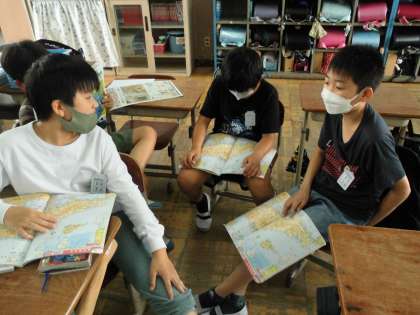 学習が始まるまでの時間に地図帳を開いて地名クイズを出し合っています。とっても楽しそうです。