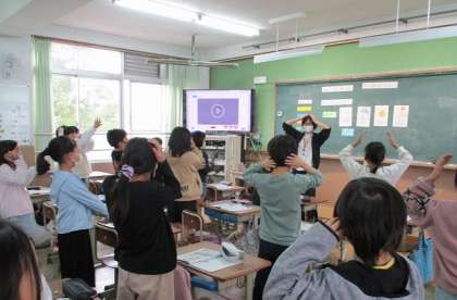天気の言い方を練習しています。「言えるようになってうれしい。」と教えてくれた子もいます。他にも,体の部分など歌に合わせて楽しく学習をしていました。