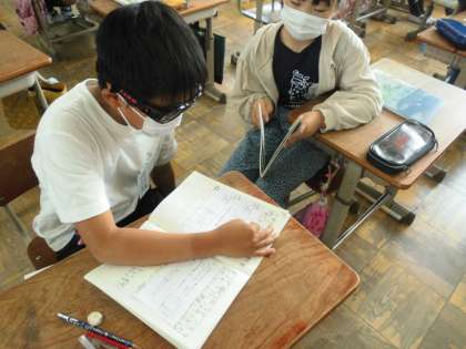 比例の関係について友達同士で確かめあったり,教え合ったりできました。全体交流の場では自分なりの「ナイス考え」を交流し,みんなでより良い考え方を吟味していました。
