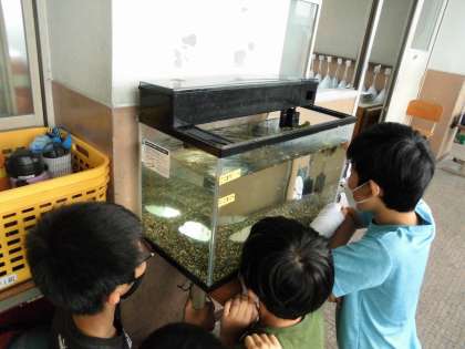 「先生!メダカがたまごうんだ!」よ〜く見ると尾びれに小さな卵のつぶつぶ。よく見つけたね。