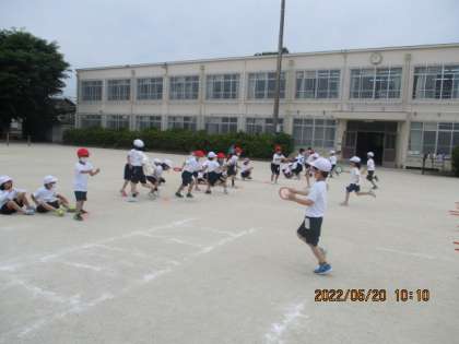 1年生は体育で,「ぴょんぴょんリレー」をしました。お友達とバトンをつないで,1番を目指します。「がんばれー」「みんなはやくすわって」声援がとびかいます。どの子も楽しく一生懸命走っていましたよ。