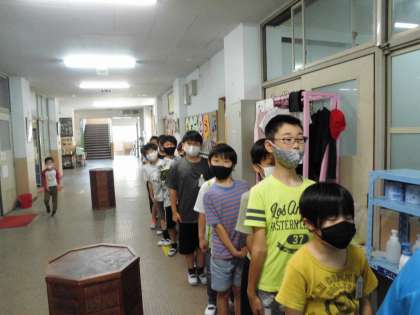 保健室の前で静かに整列して待っています。さすがです。