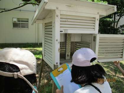 百葉箱で気温を確認して,観察カードに記録している様子です。