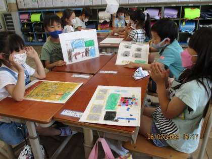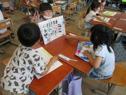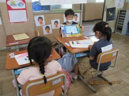 国語科「こんなものみつけたよ」の学習で,学校探検で見つけたお気に入りのものを友だちに紹介しました。「体育館にとび箱がありました。跳んでみたいです。」「家庭科室にコンロがありました。料理をしてみたいです。」など,それぞれに,お気に入りのものを伝えることができました。