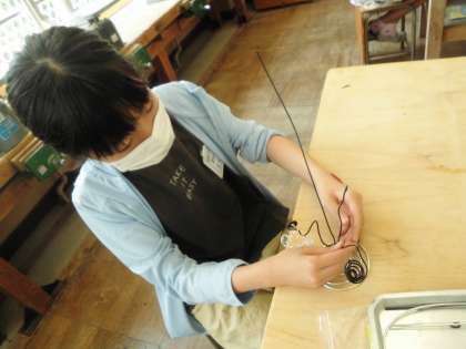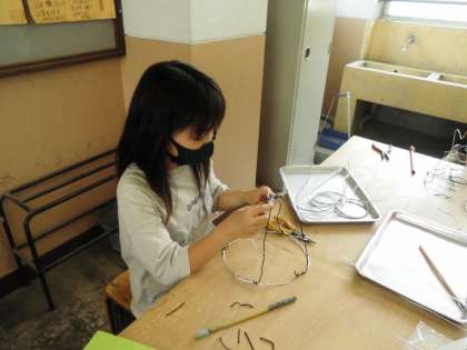 太さの違う針金を曲げたりねじったり,巻き付けたりしてバランスを考えながら立体的な作品つくりに挑戦です。
