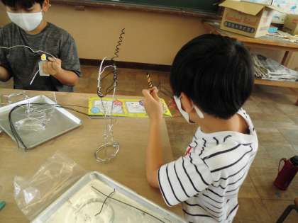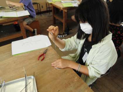 太さの違う針金を巻き付けたり伸ばしたり,アイデアスケッチのイメージを膨らませて作っていきます。