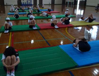 マット運動の前に,「ゆりかご」「ロバキック」「かえるの足打ち」「川とび」の体慣らしをします。このとき手はしっかりつけているかな?腰は高くあがっているかな?などと確認しています。ひとりひとり学習のめあてを持って,技の習得を目指して頑張っています。