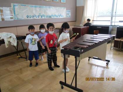 学校たんけんで音楽室を探検しました。前回,2年生に案内してもらって,楽器がたくさんあることを知っていた子どもたち。今日は「楽器を触ってみたい」という声が多かったので,いろんな楽器の音を鳴らしてみました。たくさんの楽器,早く演奏したいですね。