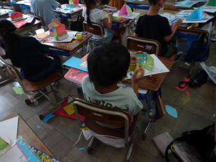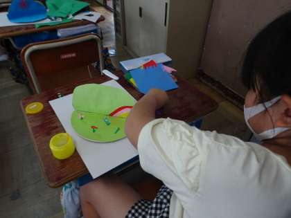 紙を重ねてわりピンでとめると,少しずつ回すことができます。画用紙を立てて壁にし,表と裏で場面を変えることもできるし,3つ,いや4つにも場面をわけることができます。どんな場面を作るとおもしろいかなと考え,「春・夏・秋・冬にわける。」とか「教室の中と運動場がいい。」など素敵なアイデアがたくさん出てきました。出来上がりが楽しみです。