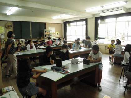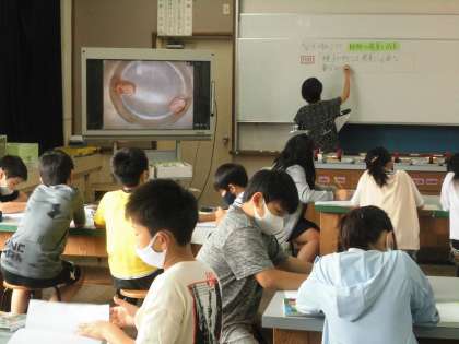 発芽の条件と成長の学習です。種子の中に発芽に必要な養分があるかどうかを調べる実験をするために理科室での学習です。