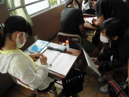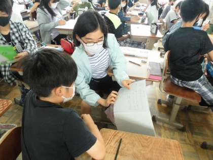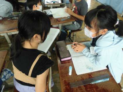 「小数の割り算」の学習です。今日は小数÷小数の計算の仕方を考えました。どのように考えたのかを話し合っています。今までに学習したことをフル活用して問題に取り組みました。よく考えています。