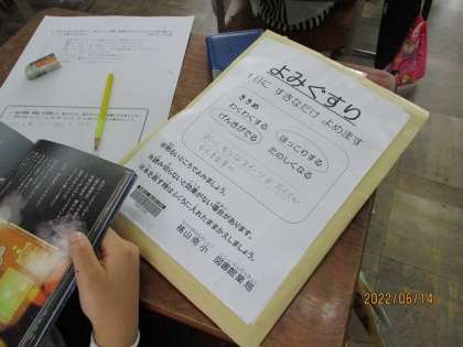 図書室からおすすめの本のセットを借りている子がいました。図書室でも本を読んでもらおうと工夫をしています。図書室の本や学級文庫,廊下にある学習に関連する学年の本など,様々な本を手に取り,楽しんでほしいと思います。