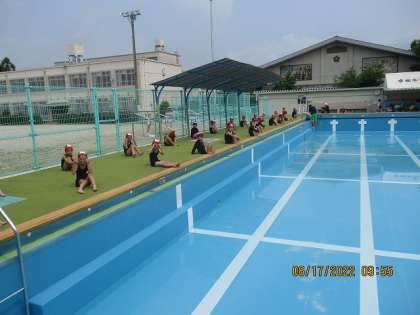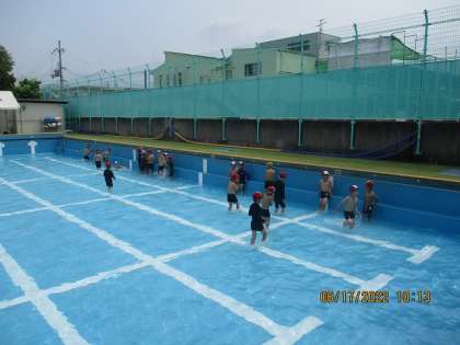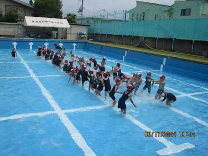 本日,初めての水遊びの学習を行いました。先日のイメージトレーニングの効果もあり,学習に入るまでは順調です。いざ,水に入ってみると,水の冷たさと気持ちよさで,子どもたちは,満面の笑顔でした。今回は,低水位での水慣れでしたので,ワニ歩きや水のかけあいをして楽しみました。