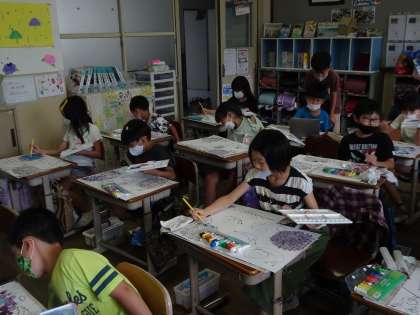 水や絵の具の量を調節して,下書きの線を消さないように,彩色していきました。
