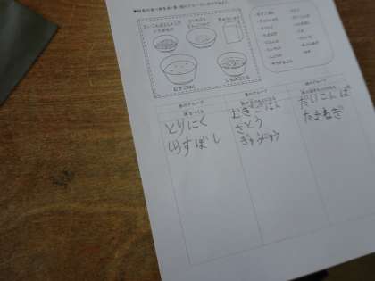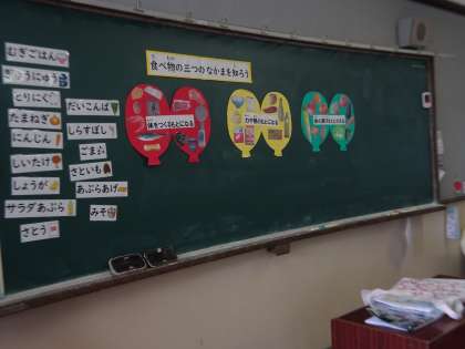 「食べ物の三つのなかまを知ろう」というめあてで食の指導がありました。赤い食べ物は体をつくるもとになる。黄色の食べ物は力や熱のもとになる。緑の食べ物は体の調子をととのえる。ということを学習した後,いろいろな食べ物を仲間分けしてみました。「ごまってどこの仲間?」「しょうがはどこに入る?」などとみんな一生懸命考えながら仲間分けをしました。これからは,給食カレンダーに書いてある食品の仲間分けも意識して見ていけるといいです。