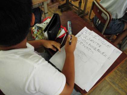 みんなで大切に育てていたカメのチョコがいなくなってしまいました。みんな朝からずーっと探しています。チョコを探すポスターを作っていました。