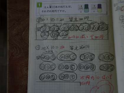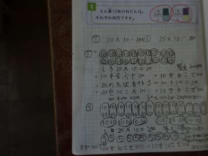 1本20円のえんぴつ10本のねだんは何円?という問題。1本10円ならできるのに・・・10円玉を使えば・・・。これまでに学習してきたことをなんとか使えないかな?と考え,とにかく自分の考えをノートに書きました。やっとできた!と思ったら,今度は1本25円のえんぴつ10本のねだんを求める問題に・・・。難しいと思っていたけれど,同じように考えてみれば・・・。試行錯誤,頭をフル回転して解答にたどり着いたときの笑顔はみんなすっきりいい笑顔でした。「どんな数でも10倍すると,位が1つ上がり,右はしに0を1こつけた数になる。」なるほど,なるほど,もうノートいっぱいにお金の絵をかかなくてもこれからはできそう!