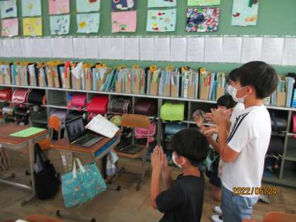 班でリズムうちの練習をして,「楽しいマーチ」の動画を撮りました。より良い演奏になるように,動画を何度も取り直していました。