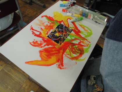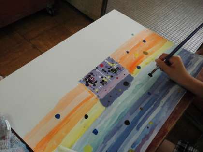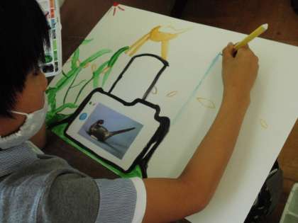 図画工作の時間に,誰も見たことがない世界を想像して描きました。以前選んだ写真をさらに広げて描くという方法で描いていきました。続きを想像しながら描き,お互いの絵を見て「すごい」と驚いていました。