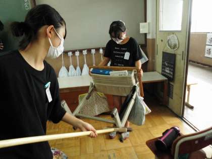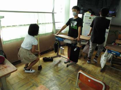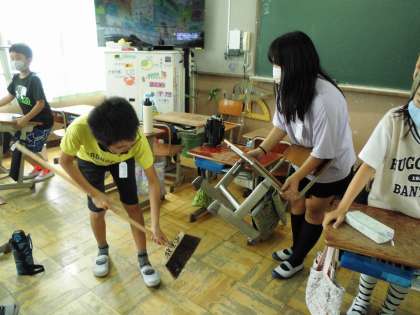 机の脚の裏やいすの足の裏までチェックしています。ごみやほこりを一つ一つ徹底的に掃除しています。すごい!