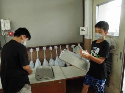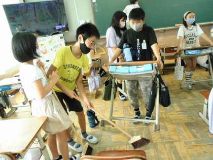 机やいすの脚の裏までほうきで丁寧に掃いてホコリを取っています。配ぜん台もきれいにしてくれていました。ありがとう。