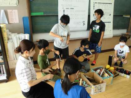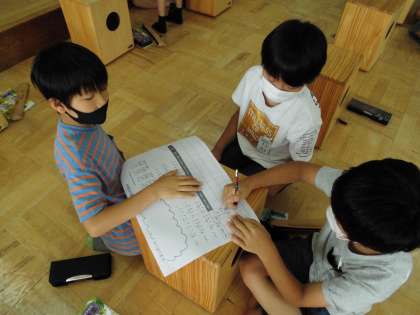 三人組でリズムアンサンブルに取り組みます。どの楽器を使おうかな?どんなリズムにしようかな?