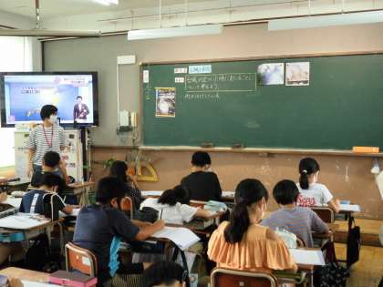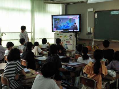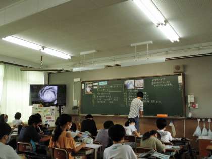 台風と防災についての学習です。台風4号が来ていることもあり、台風が来るとどのような被害が起きるのかたくさんの意見が出ました。
