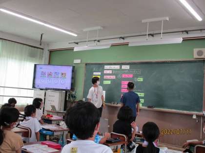 1学期の外国語活動は、今日が最後でした。好きな時刻とその理由を友だちと話して交流をしていました。1学期は、天気や曜日、時刻を英語で言えるようになった子がたくさんいました。