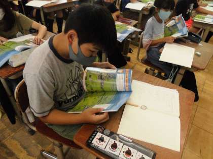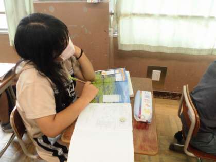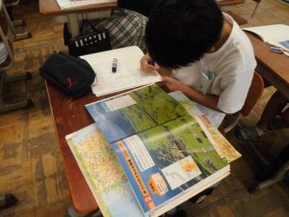 「米つくりのさかんな庄内平野」の学習です。地図帳で山形県の位置や土地の様子を調べました。教科書の庄内平野の写真と比べて気が付いたことを話し合いました。