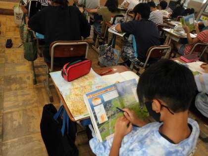 地図や教科書の写真を比べ,たくさん気が付いたことを交流しました。