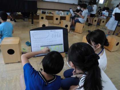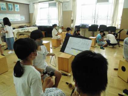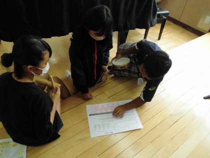 「打楽器でリズムアンサンブル」の学習です。3人の組になって音色の組み合わせやリズムの重ね方を工夫しながらリズムアンサンブルを作っています。みんな熱心に話し合っています。