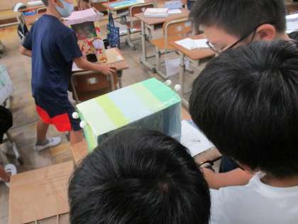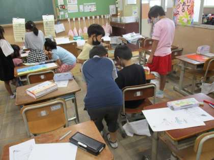 夏休みの宿題である、自由課題を交流しました。工作や夏休みの絵日記を書いてきた子もいました。どの作品も力作でした。みんな嬉しそうに説明してくれました。9月中旬頃まで展示しようと思います。