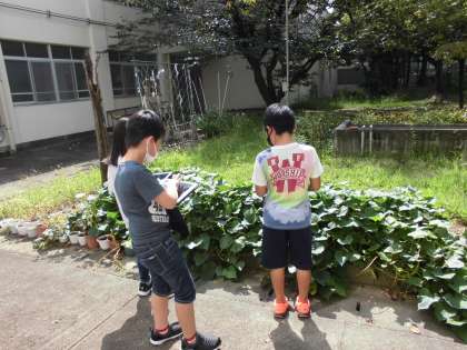 2学期になって初めて、あおぞら畑の観察に出ました。キュウリとトマトは枯れてしまいましたが、サツマイモはとても元気に大きくなっていました。ナス・トウガラシも、まだ花を咲かせています。秋までまだまだ収穫できそうだと、子どもたちは喜んでいます。
