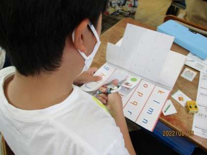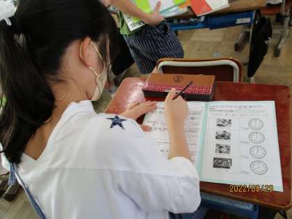 文房具の言い方を練習しています。身近な物を英語で言うのは、楽しそうでした。授業の最後には、ふりかえりをプリントに書きました。