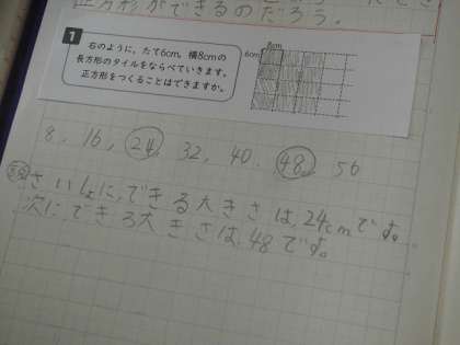 長方形のタイルを引き詰めると正方形を作ることができるのか考えました。今までの学習で公倍数から考えるとできるのではないかという予想をもとに取り組みました。それぞれやりやすい方法をノートにまとめていました。