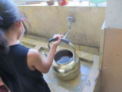 やかんの水を片手で持ち上げてみましたが、とても重たそうにしていました。