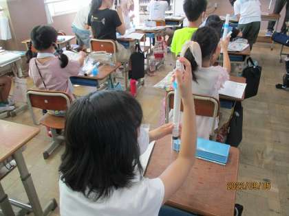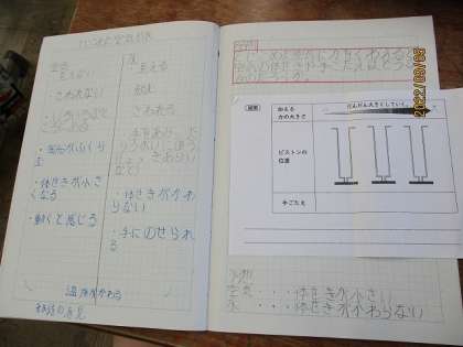 とじこめた空気に力を入れるとどうなるかを予想し、実験をしました。「空気が重たい?」や「押しかえされる?」と話しながら、手ごたえを感じていました。