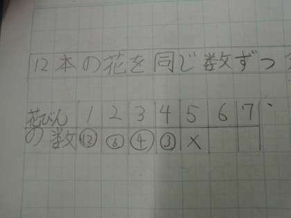 倍数の次は約数です。12本の花を花瓶に同じ数ずつ分けることができるのは、花瓶がいくつの時なのか考えました。それぞれ見つけた方法をノートに控え、考えを交流することができました。