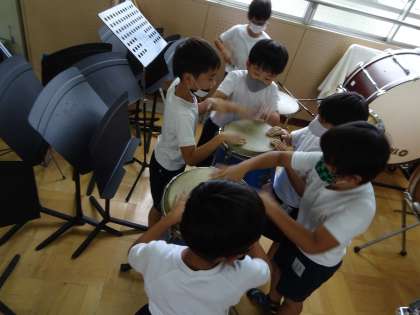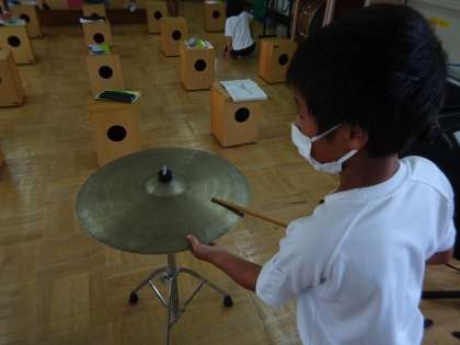 音が鳴るときってどんなとき?音の不思議を見つけに音楽室へ行きました。たくさんの音をきいてまわりました。「たいこをたたいたら振動がきた。」などと気づきがありました。