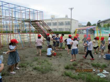 子どもたちは、マヨネーズなどの空き容器を使って、水遊びを楽しみました。