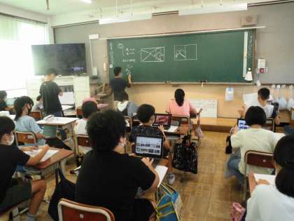 「お話の絵」をかいています。画用紙にどのように描くとよいのかを説明しています。