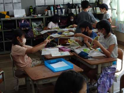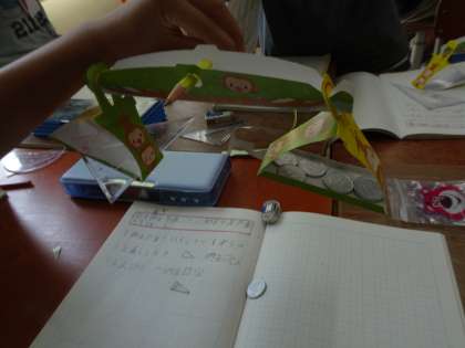 1円玉1個の重さは1g。「CMでやってたー。」「聞いたことあるー。」などとあちこちから声があがりました。お手製のてんびんを使って、鉛筆や三角定規の重さを測りました。他にも測ってみようと意欲いっぱいの授業でした。