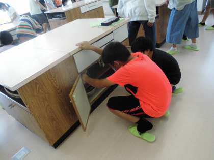 美しくなった家庭科室へ行き,調理道具などの確認をしました。