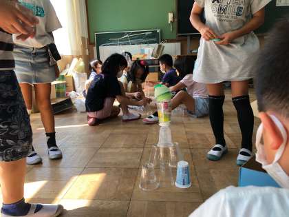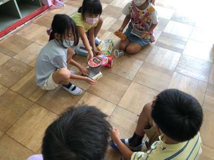 生活科では、いらなくなった容器やペットボトルなどを使って遊びを考える学習をしています。みんなで持ち寄った廃材を使ってどんな遊びができるのか考えてみました。「つむ」・「ならべる」・「はじく」・「ころがす」・「たたく」など簡単な動作で楽しい遊びができることに気づいていた子どもたちでした。