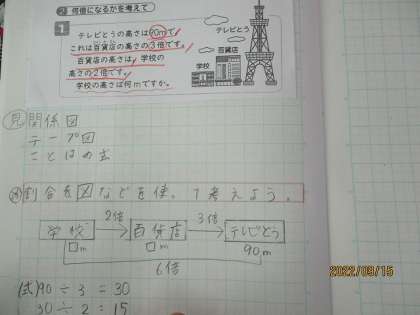 関係図を書いてわからない量を求めました。問題に線を引いたり、友達と話したりしながら考えています。
