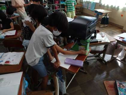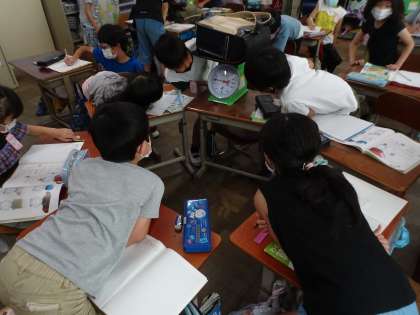 今日はランドセルの重さをはかってみました。その後、ほかの物もどんどんはかりたくなって、目につくものから順にはかりました。何度も繰り返す内に、目盛りの読み方に慣れてきました。