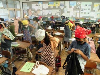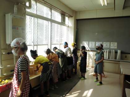 初めての調理実習!まずは身支度を整えて,手をしっかり洗って,ガスコンロの準備をしています。さぁ!がんばって協力しておいしいゆで野菜サラダを作ろうね。