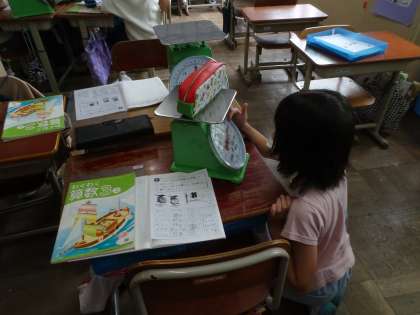 はかりたい物の重さを予想し、どのはかりを使うかを考え、はかってみました。保健室へ行って体重をはかった子もいました。
