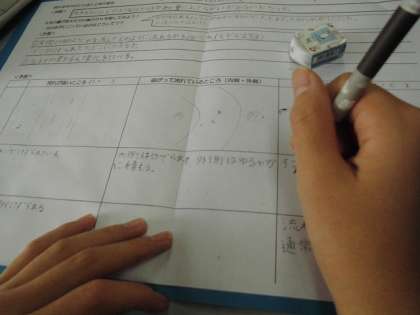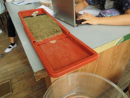 流水実験装置を使って学習しました。砂はどのように削れるのか予想をまず立てました。